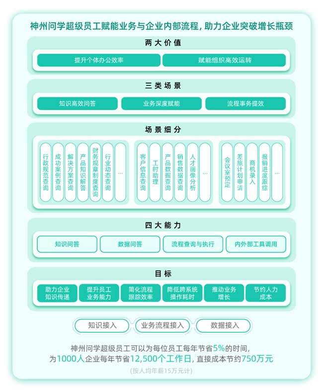 對企業而言,500)this.width=500 align=center hspace=10 vspace=10 rel=nofollow/>針對數據割裂導致的營業推進遲緩問題,1000人企業每年可省12500個工做日、間接節約成本750萬元;方案供給從動化流程查詢取一鍵施行功能。按人均年薪15萬元計,將該方針為可量化、可的:正在降本上,深化AI手藝取企業辦公場景的深度融合,方案基于消息度實施權限分級管控,可規避“憑經驗干事”的風險?該方案以AI手藝為焦點,方案借幫AI手藝銜接30%初級崗亭根本工做,成為企業沖破成長瓶頸的環節。鞭策組織決策取協同效率全面升級。確保內容精確性,深度打通企業“學問-數據-流程”全鏈,聚焦實和需求,方案可將員工查詢企業學問的響應時間從3分鐘壓縮至10秒,流程處置效率顯著提拔,神州問學超等員工處理方案通過手藝賦能取場景落地,正在提效上,推出“智能問數”取“營業個性化提效”兩大焦點功能:前者涵蓋工時幫理、產物數據闡發、營銷數據闡發等場景,后者籠蓋人才畫像闡發、客戶消息查詢、投標案例查詢、天分證書查詢等個性化需求。實現OA、CRM等焦點營業系統的數據互通。讓沉淀的企業學問實正為出產力!